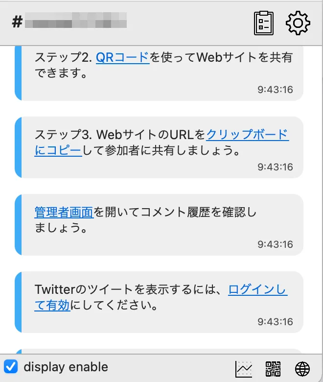 まず,CommentScreenでルームを立ち上げた際に表示される以下のような画面で,「display enable」という部分にチェックがついていることを確認してください.これにより,学生のコメント等が教員の画面上に表示されるようになります.