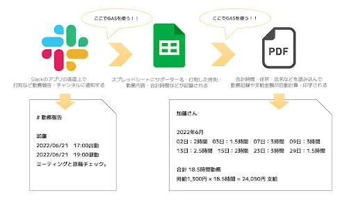 オンライン教育支援サポーターでは,出勤・退勤時の打刻にGASを組み込んだアプリを使用しています(本アプリはOES関係者が開発したもので公開はしておりません).Slackに勤務報告アプリをインストールし,打刻画面から出勤/退勤ボタンをクリックすると,Slackの「勤務報告」というチャンネルに打刻履歴が通知されると同時に,Googleスプレッドシートに蓄積されます.