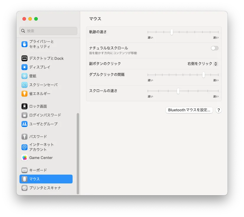 2. 左側の設定項目を下の方までスクロールして「マウス」をクリックしてください.
