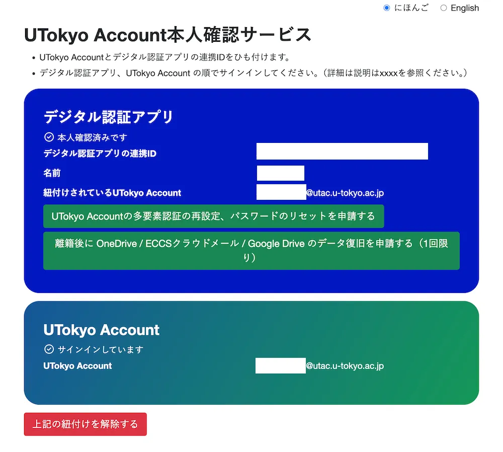 連携状況は,UTokyo Account本人確認サービスまたはUTokyo Account利用者情報確認サイト上で確認することができます.