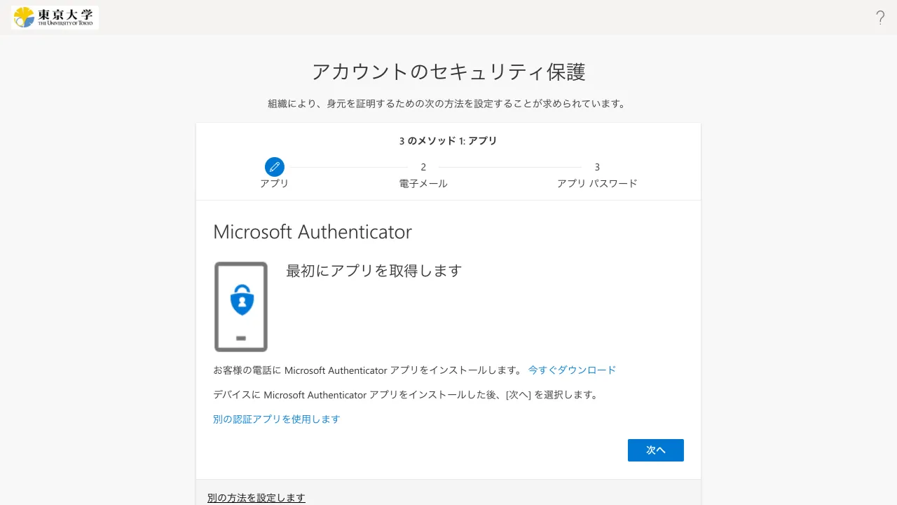 「Microsoft Authenticator」は,Microsoftが提供している多要素認証のための専用のアプリです.UTokyo Accountの多要素認証はMicrosoftのシステムを利用しているため,他の認証アプリよりスムーズに利用できます.2台以上のスマホを持っている場合は,2台目以降のスマホにインストールした「Microsoft Authenticator」を追加の本人確認方法として,手順2で登録することもできます.