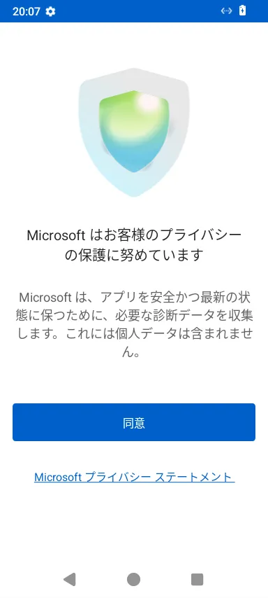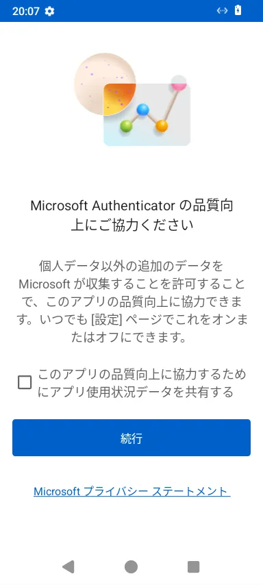 - スマホでMicrosoft Authenticatorアプリを起動してください.なおこの際,インストール後初めてアプリを起動したという場合は,プライバシーに関する事項の同意やデータ収集に関する設定の確認が求められますので,順に進めてください.