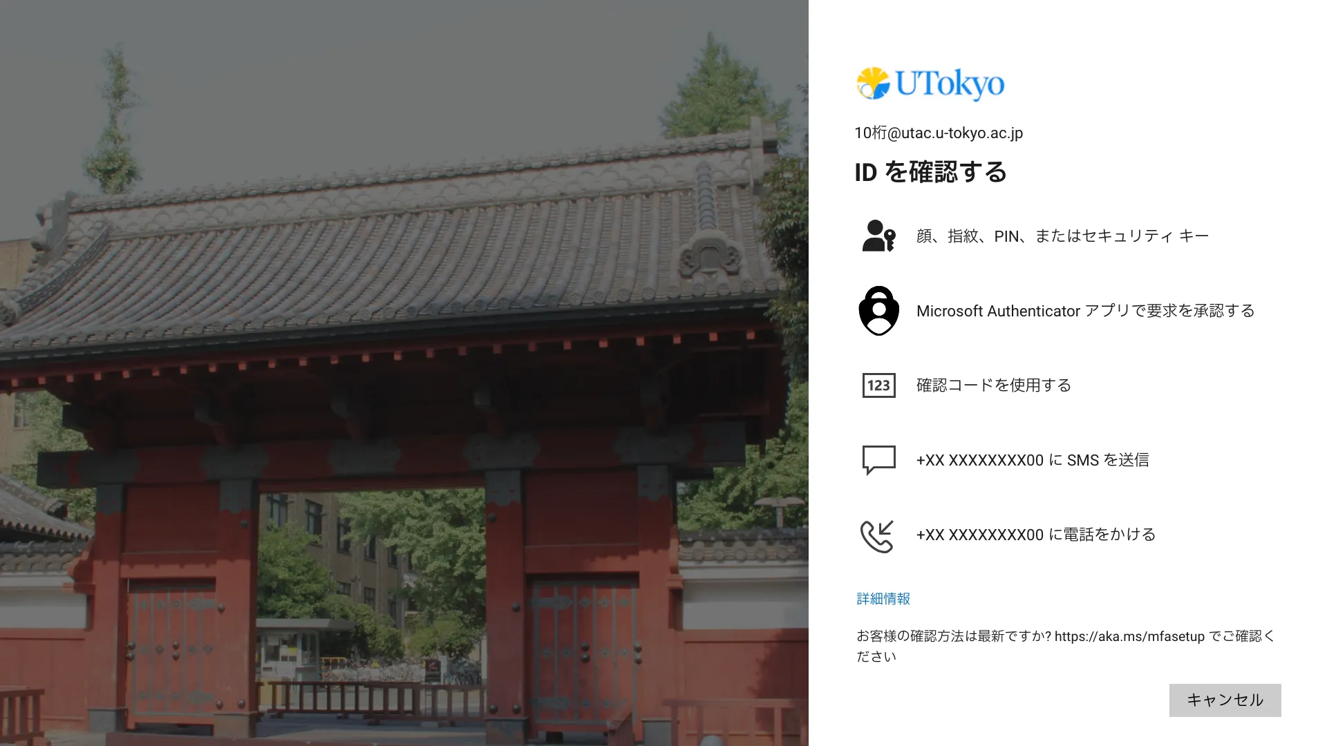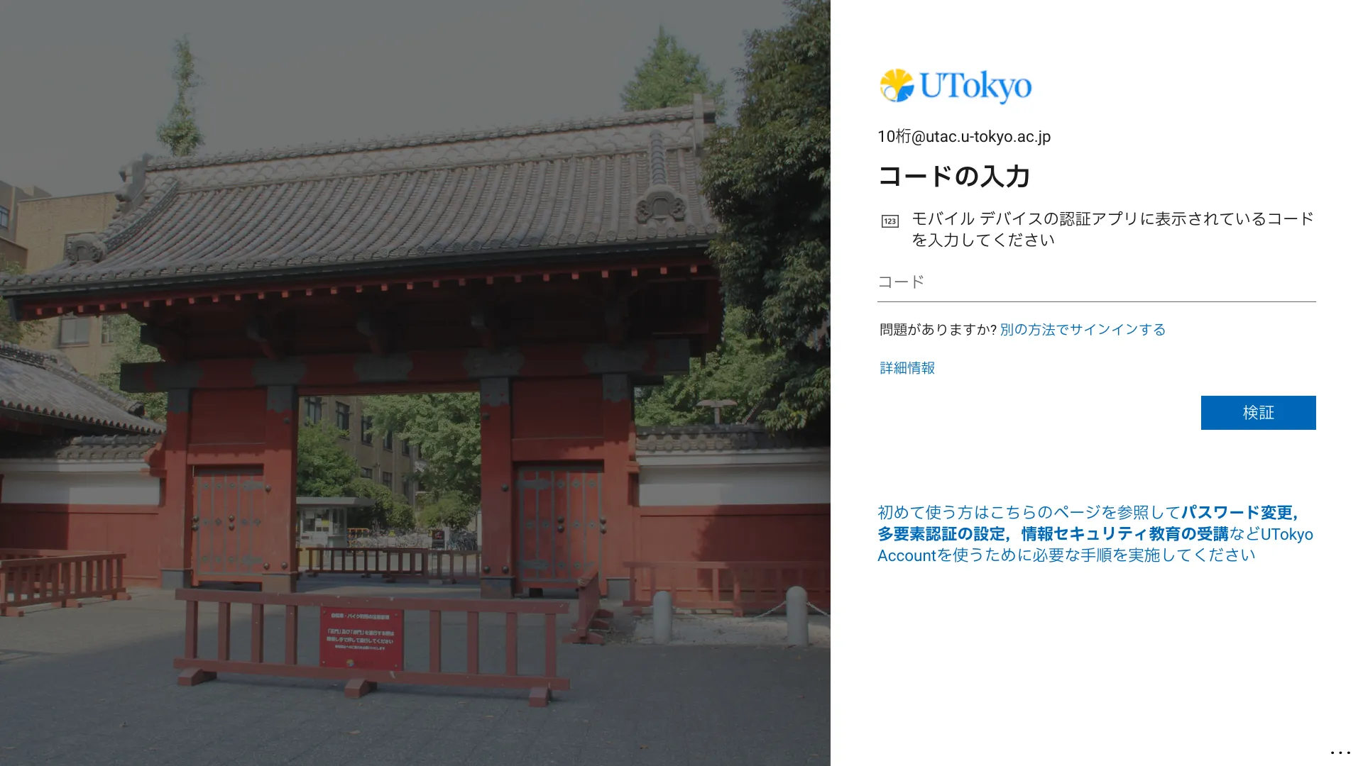 @utac.u-tokyo.ac.jp)とパスワードを入力してください. - 続いて多要素認証の本人確認が行われます.本人確認方法により手順が異なりますので,画面の指示に従って操作してください.