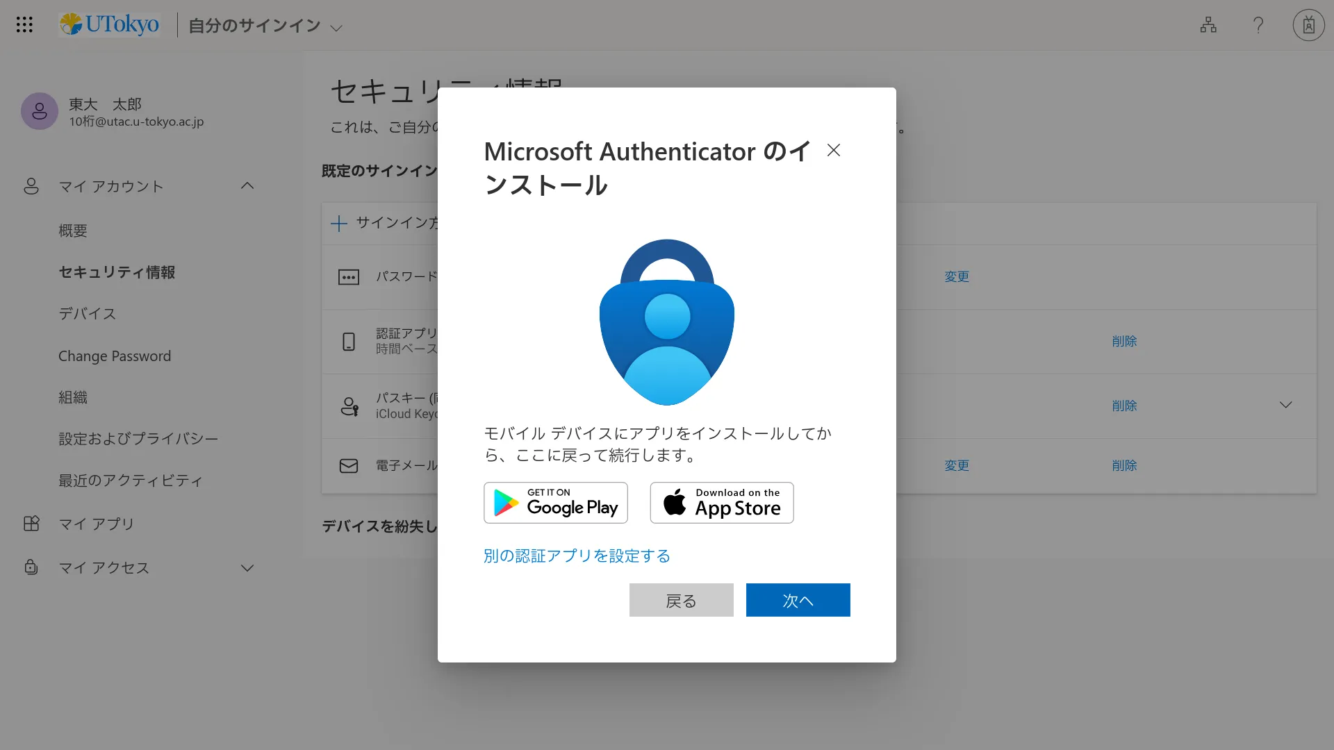 @utac.u-tokyo.ac.jp)とパスワードを入力してください. - 「詳細情報が必要」という画面が表示されるので,「次へ」を押してください.