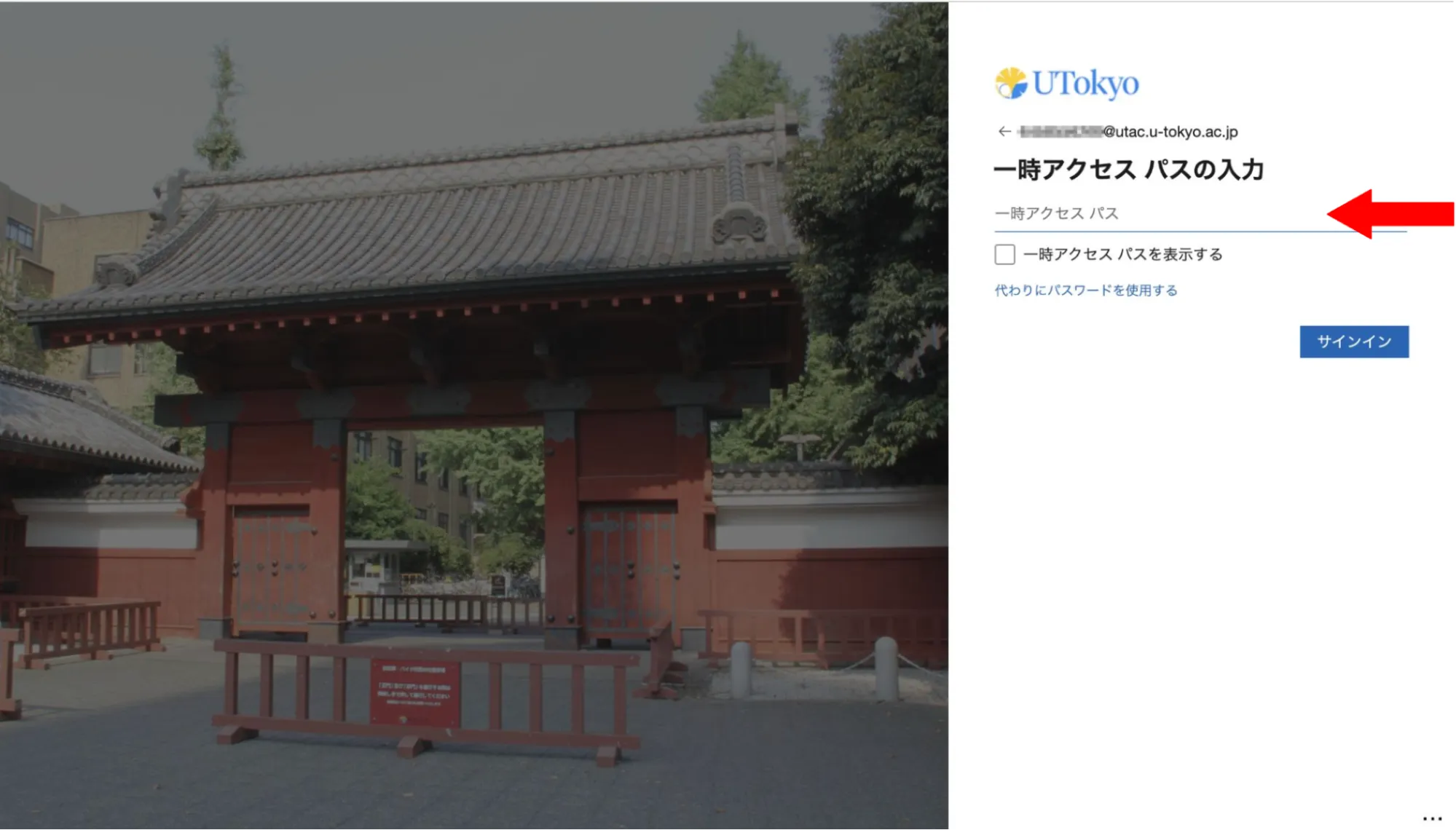 サインインを要求されるので,IDに自分のUTokyo AccountのID,パスワードに先ほど発行された一時アクセスパスを入力し,サインインしてください.