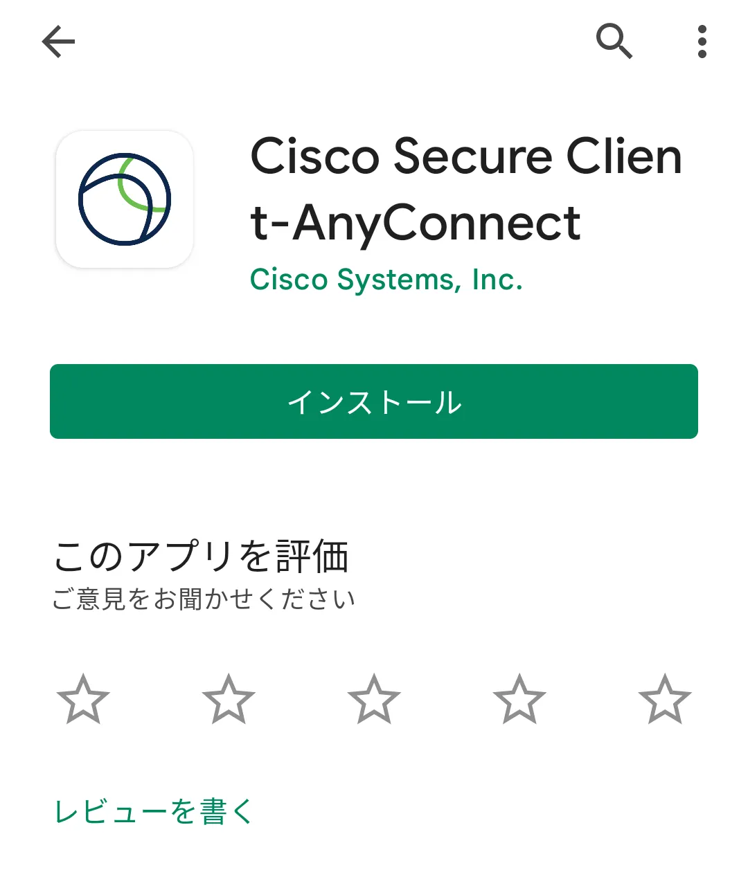 手順A: Google Playにアクセスし,Cisco Systems社のSecure Clientというアプリをインストールします.このアプリは以前,AnyConnectという名前だったため,以下の画像ではこの2つの名前が併記されています.
