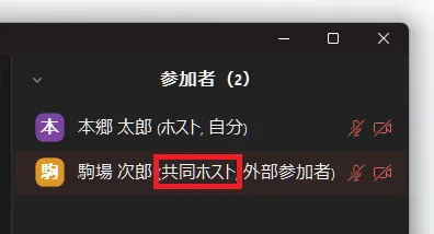 共同ホストとは,あるミーティングにおいて,ミーティングの進行に関する機能に関して,ホストから管理権限を付与された役割のことです.ホストと異なり,同一ミーティングに対し複数名が存在することが可能です.ミーティング中に誰が共同ホストになっているかを確認するには,「参加者」ボタンを選択してください. 表示された参加者の一覧のうち,共同ホストになっている参加者には,名前の右側に「(共同ホスト)」の表示があります.