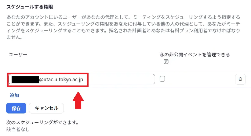 4. 「代替ホスト」欄に,追加対象のユーザーのUTokyo Account(数字10桁の共通ID + @utac.u-tokyo.ac.jp)を入力してください.