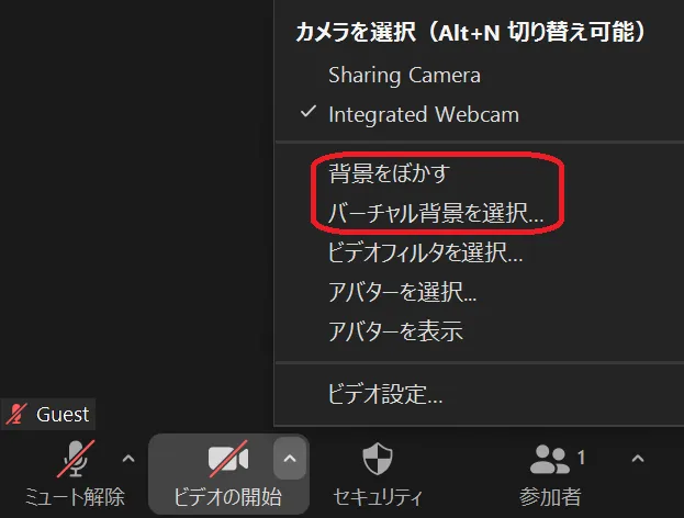 2. メニューの中から「バーチャル背景を選択」を選んでください.「ぼかし」を使いたい場合は「背景をぼかす」を選択してください.